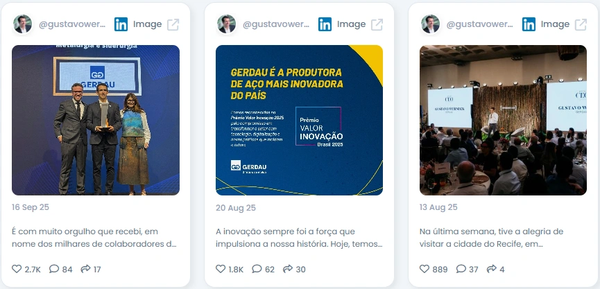 Gustavo’s audience has grown from 91,000 to over 129,000 followers in two years, with steady organic growth and no artificial spikes. He holds an Influence Score of 7,724 points, ranking in the Top 1% of LinkedIn creators in Brazil and among the Top 350 CEOs & Tech Leaders worldwide. His posts regularly attract thousands of reactions, strong engagement rates, and meaningful discussions. These numbers confirm that his influence extends beyond the boardroom and into the wider conversation on corporate sustainability.