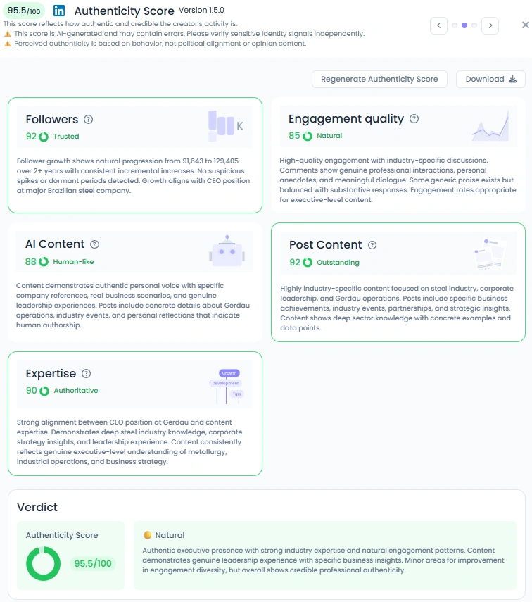With a Favikon Authenticity Score of 95.5/100, Gustavo’s profile shows genuine executive presence. His writing is personal and insightful, offering real details about projects, teams, and achievements. Comments on his posts are filled with professionals from across Latin America acknowledging his leadership and expressing admiration for Gerdau’s innovation. His communication style blends authority with approachability, showing that even at the highest corporate level, authenticity can drive connection.