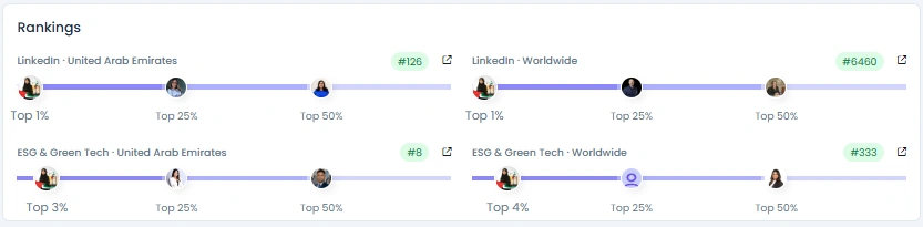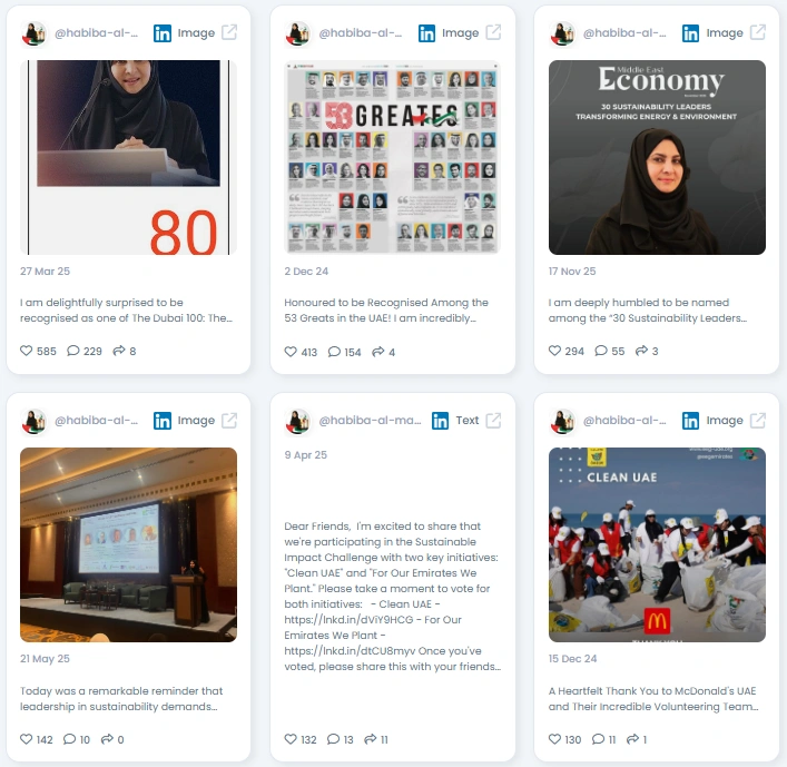 Habiba’s follower base grew organically from about 17,285 to over 20,000 across two years, reflecting steady regional interest. Her Influence Score sits at 5,664 points with high engagement quality for an institutional and professional audience. She ranks in the top tier for ESG and Green Tech in the UAE and shows strong regional visibility. Her posting rhythm aligns with events, campaigns, and awards, which keeps followers informed and engaged.