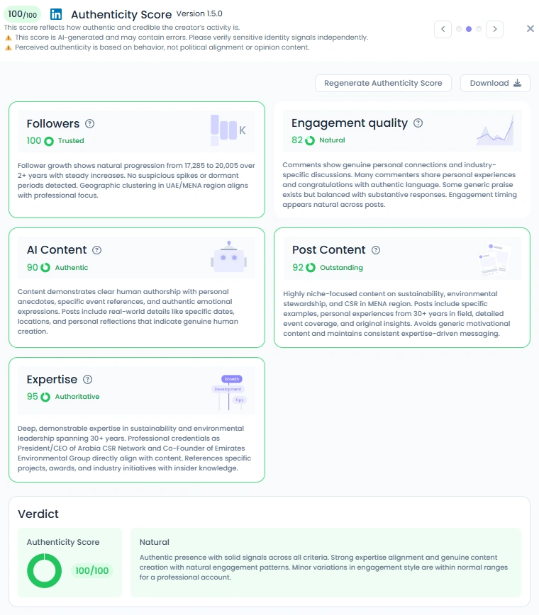 Habiba scores 100 out of 100 on Favikon’s authenticity index. Her feed shows consistent, human authorship: event photos, award announcements, community cleanups, and personal reflections. Engagement from peers and stakeholders is substantive and specific, showing that her reach is meaningful and trusted. Her presence demonstrates sustained commitment rather than one-off signals.