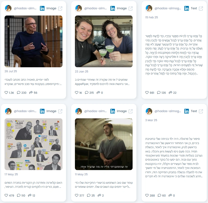 Hadas stands out because she writes with heart, honesty, and clarity. Her posts are reflective yet actionable, often blending personal experiences with professional lessons. She addresses complex topics like burnout, inclusion, and generational change in ways that feel accessible and relatable. Her tone is warm and conversational, creating space for real dialogue instead of one-way communication. Readers engage because they see their own workplace challenges and aspirations reflected in her words.