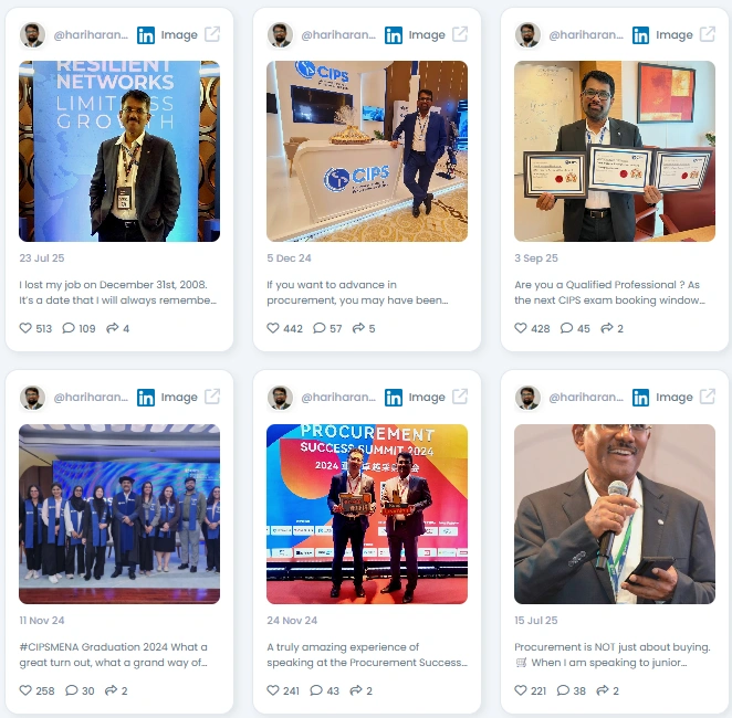 Hariharan makes procurement feel simple and powerful. He shares clear playbooks, practical tools, and real stories from the region’s biggest events. One post celebrates graduates, the next breaks down certification strategy step by step. His feed is a masterclass for anyone who wants a serious career in supply.