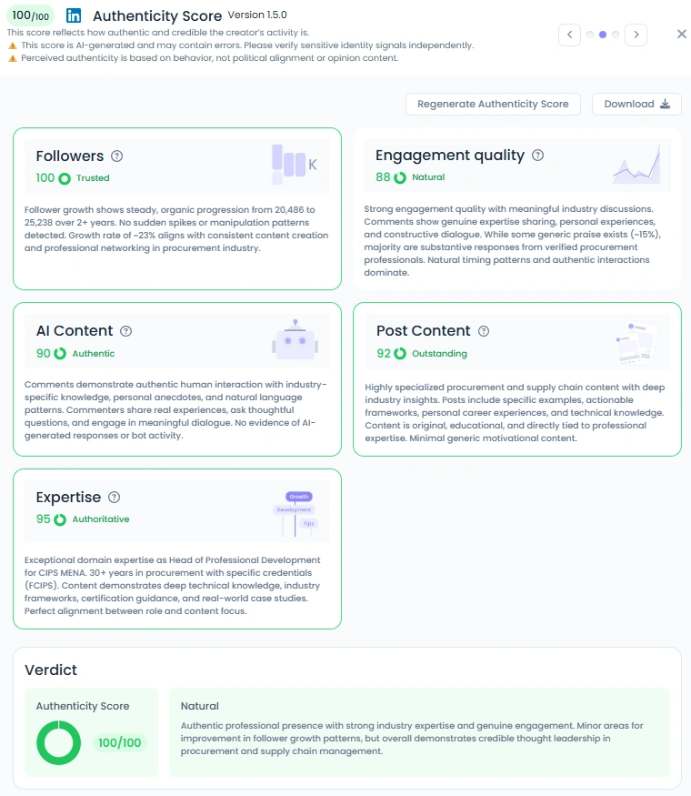 Favikon Authenticity Score: 100/100 Comments show real practitioners trading examples from tenders, logistics, and audits. He shares photos from graduations, live stages, and exam days. Motivational fluff is minimal. The substance is technical, current, and human.