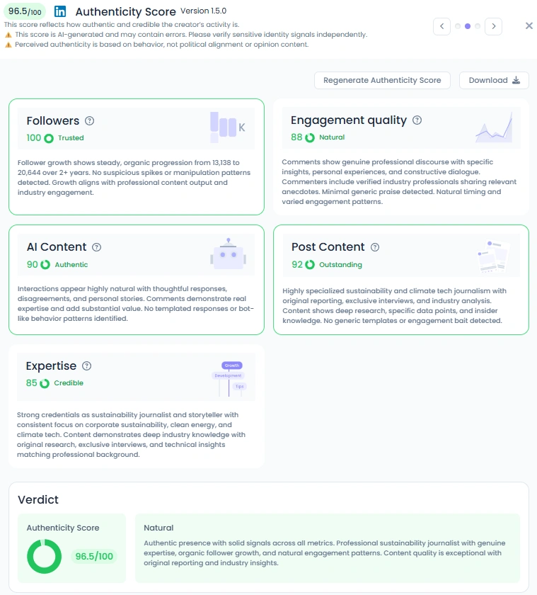 Heather’s following has grown steadily from 13,000 to over 20,000 professionals in the past two years. With an Influence Score of 5,240 points, she ranks in the Top 1% of Climate Journalists worldwide and among the Top 5% of LinkedIn creators in Canada. Her engagement quality score of 88/100 shows her ability to spark meaningful dialogue among sustainability experts, researchers, and executives. Her consistency and audience trust make her one of LinkedIn’s most credible sustainability communicators.