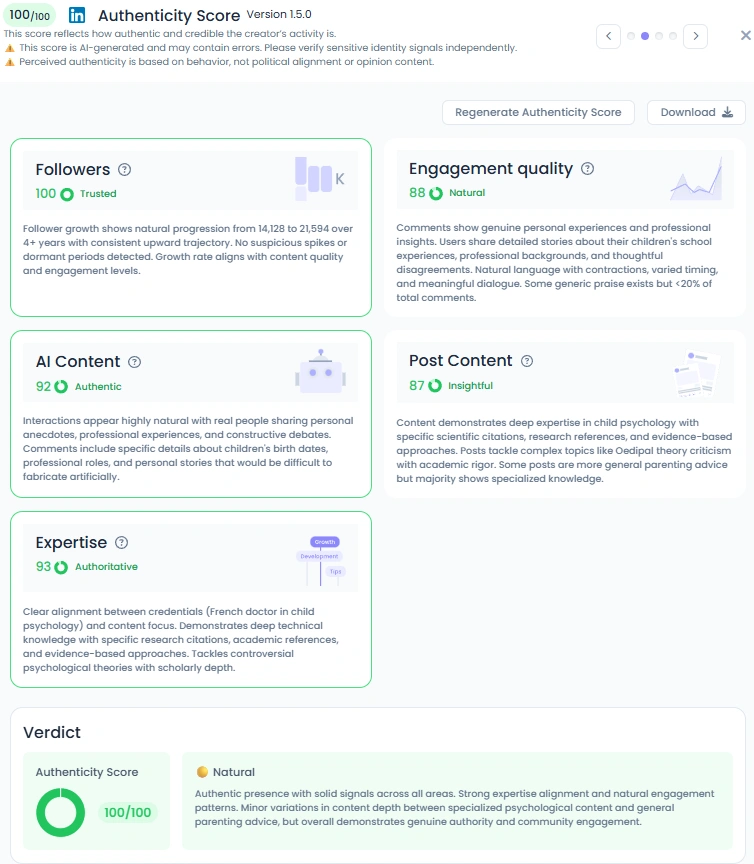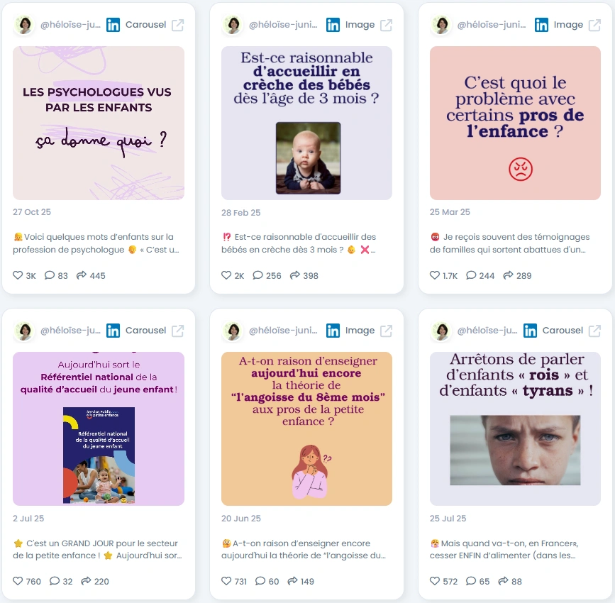 Héloïse holds a 100/100 Authenticity Score, and her feed reflects a genuine community built on trust. Her comment sections are full of personal stories from parents, educators, and childcare workers. They share anecdotes about school experiences, their children’s emotions, and their own professional dilemmas. Her content includes carousels, simple text posts, and scientific references that keep everything grounded. She feels relatable without losing professional authority, which is rare in parenting content.