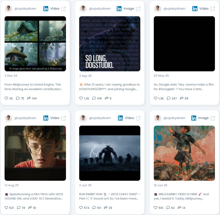 His tone is warm, curious, and confident. He explains complex creative workflows in a way that feels accessible and inspiring. His posts often carry a playful touch and show genuine excitement for new tools and artistic breakthroughs. People engage because he speaks like a creator in the middle of discovery. His audience sees both the experiments and the polished results, which builds trust.