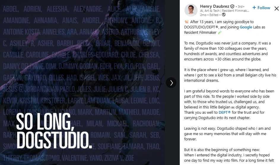 Henry is a GenAI artist and Creative Director who spent more than a decade shaping the visual identity of DOGSTUDIO before joining DEPT and later Google Labs as a Resident Filmmaker. His background spans VFX, creative technology, and high end digital production. He has worked on complex workflows that blend AI, filmmaking, and animation. His posts often reveal behind the scenes processes and tests that show the evolution of his craft. He positions himself as both an artist and a technician, pushing AI creativity to new places. His work has a clear signature that reflects years of hands on experimentation.