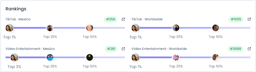 Herly RG holds a Favikon Influence Score of 8,972 points, placing her among Mexico’s top comedic and lifestyle creators. She ranks #356 on TikTok Mexico and #281 in Video Entertainment Mexico, both within the top 3%, confirming her strong presence in culturally relatable humor and culinary content. Globally, she maintains top 1% rankings in both TikTok and Video Entertainment, highlighting her growing impact among Spanish-speaking audiences worldwide.