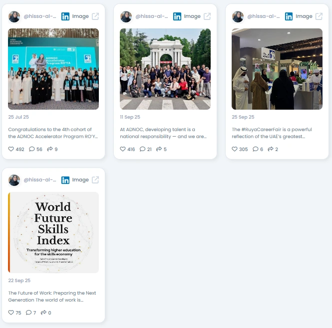 Her circle spans energy, higher education, and regional innovators. Think ADNOC programs and leadership peers, leading UAE universities, and workforce platforms that power internships and early careers. Add voices from global HR and learning communities who engage with her updates. It’s a network that can turn a promising graduate into a placed professional.
