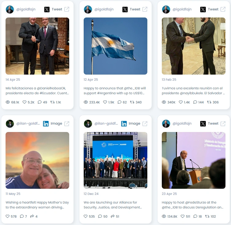 Ilan’s network spans some of the most powerful institutions in global economics. He regularly interacts with the World Bank, IMF, G20 representatives, United Nations leaders, and presidents across Latin America. His ecosystem includes ministers, central bankers, development agencies like AFD and DFC, and the full IDB Group. These connections reinforce his institutional reach and amplify the impact of every message he shares. He moves comfortably across diplomacy, finance, and policy, which positions him as a connector between governments and development actors.