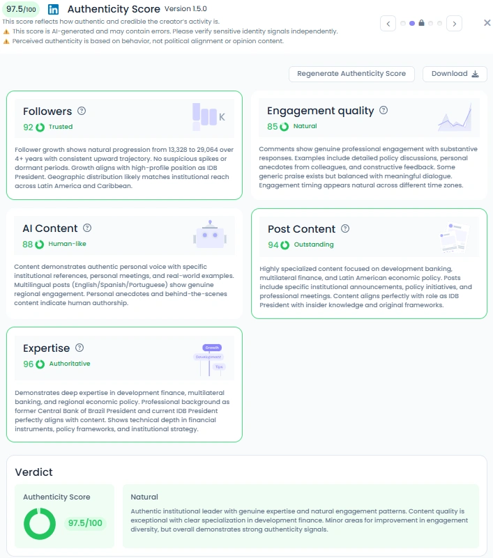 With a strong 97.5 out of 100 Authenticity Score, Ilan’s content feels both personal and authoritative. He mixes institutional announcements with multilingual posts and behind-the-scenes moments that show the human side of leadership. His engagement patterns include thoughtful comments, meaningful exchanges with colleagues, and a natural rhythm across time zones. Even his family-focused posts add warmth without feeling out of place. This balance between global responsibility and personal sincerity is what makes his presence feel genuine.