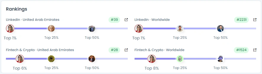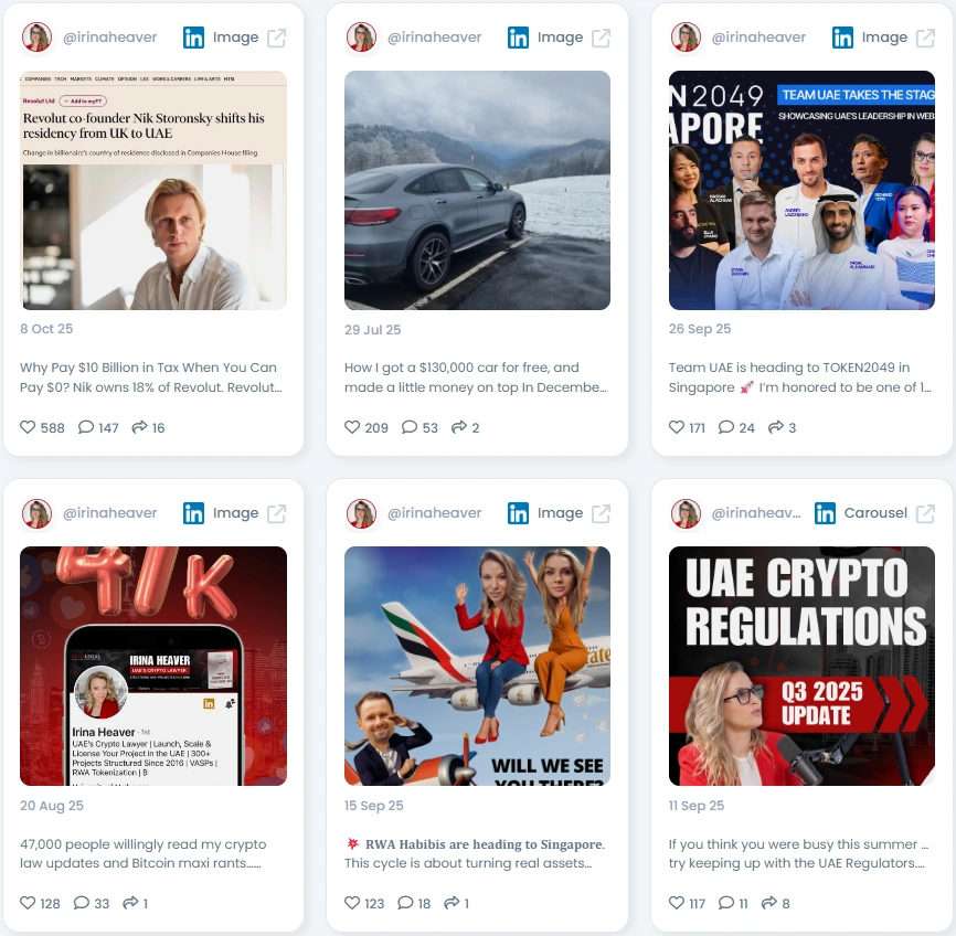 Irina boasts more than 47,000 followers on LinkedIn, with steady growth over the past three years. Her Influence Score of 7,048 points places her in the top 1% of LinkedIn creators in the UAE and top 6% in the Fintech & Crypto category. Her posts earn consistent engagement from professionals and industry leaders, maintaining an Engagement Quality Score of 88 and Expertise Score of 92.