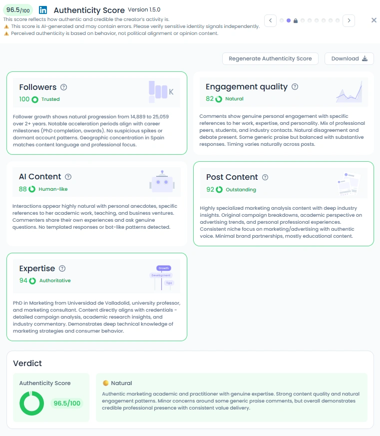 Itziar scores 96.5 out of 100 for authenticity on Favikon. Her feed blends viral TikToks, classroom moments, and conference snapshots. Comments are substantive and come from students, peers, and industry pros. Her voice is professional but warm, which keeps engagement genuine.