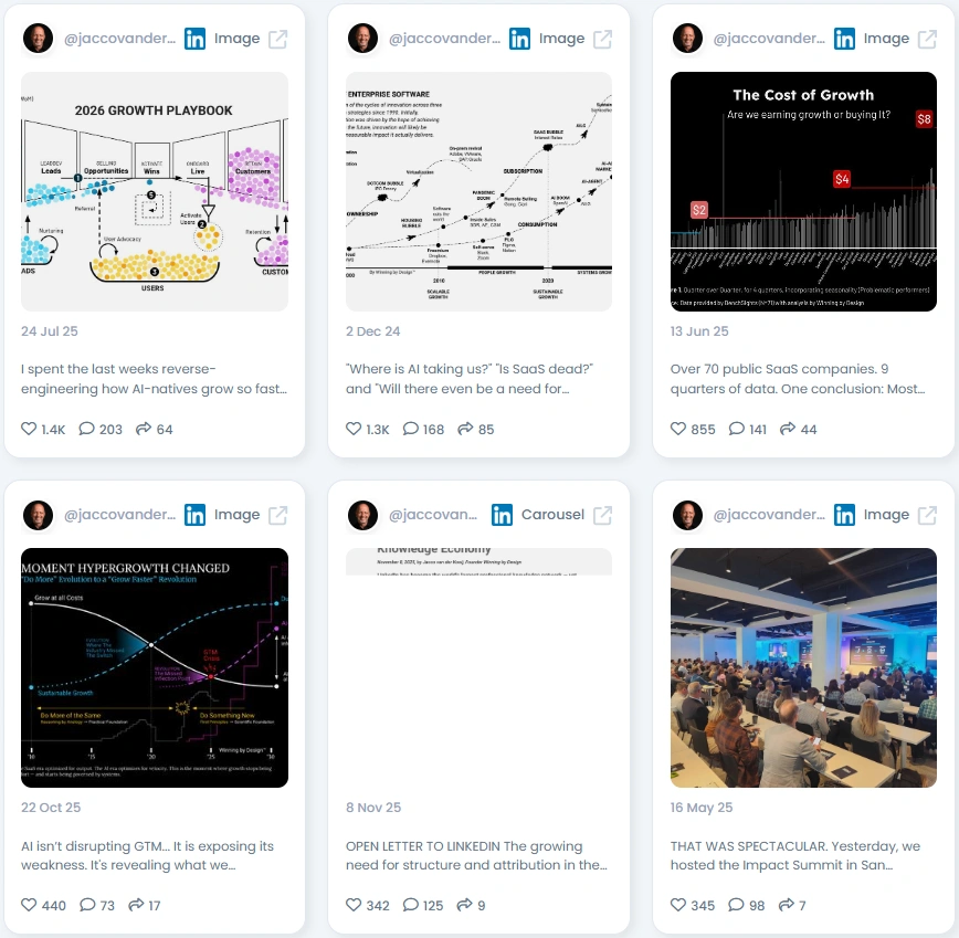 Jacco collaborates with SaaS companies, GTM operators, and executive-level leaders who rely on his frameworks to structure their revenue engines. His content frequently features insights from public SaaS data, GTM benchmark studies, and field experiences from workshops and summits. He engages with communities around revenue strategy, operational economics, and AI’s impact on SaaS. These collaborations help amplify his thought leadership and deepen his credibility within the ecosystem.