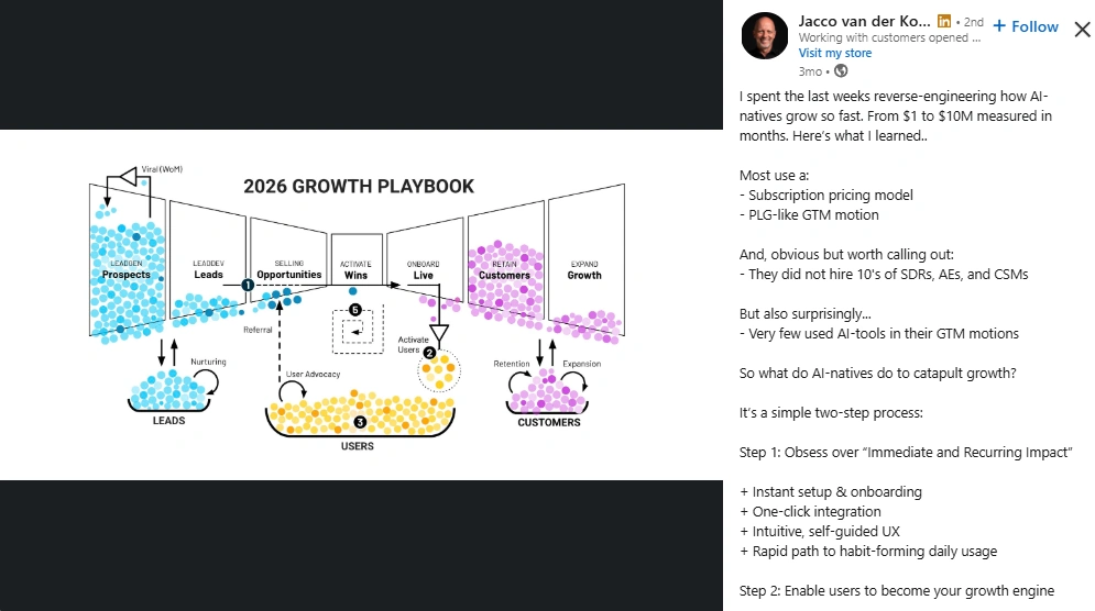 SaaS is in the middle of a massive reset. AI is reshaping GTM roles, efficiency is replacing hyper-growth, and companies are rethinking how they scale. Jacco sits at the center of that conversation. His frameworks help founders navigate the shift from hiring-driven growth to system-driven growth. His insights address the realities of AI-native companies and the new expectations around revenue efficiency. As SaaS evolves in 2026, Jacco remains one of the few voices offering clarity instead of chaos.