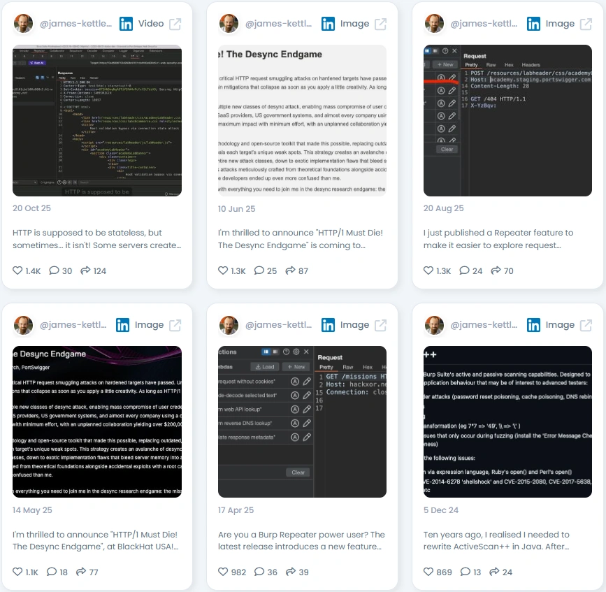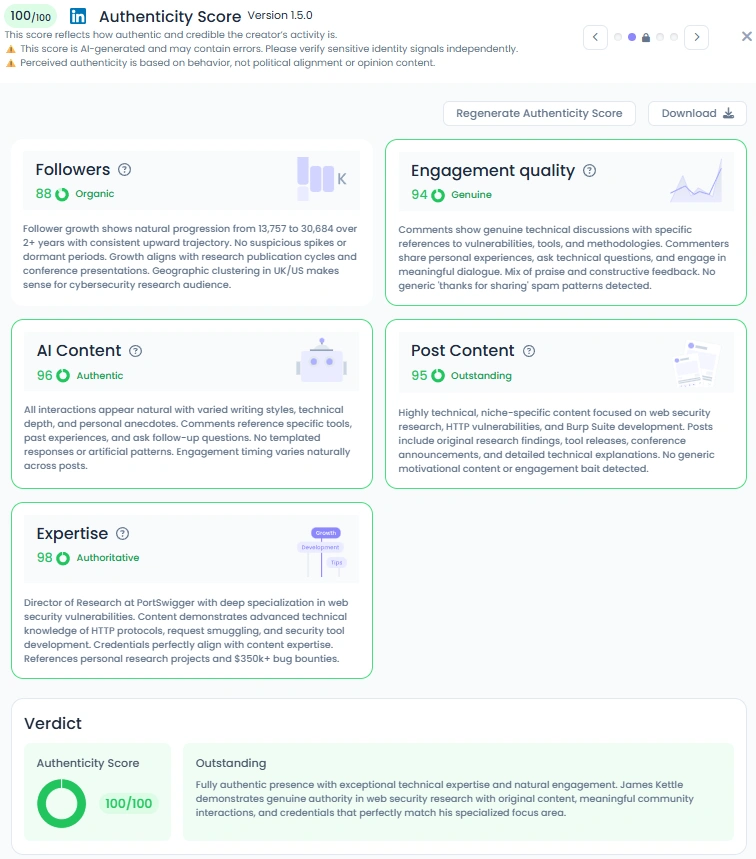 With a perfect Favikon Authenticity Score of 100/100, James sets the gold standard for credible, expert-driven content. His audience recognizes the genuine expertise behind every post, from live demos of HTTP bugs to deep-dive research updates. Comments on his posts often turn into technical discussions, with professionals exchanging insights and personal experiences. His authenticity lies in his precision: no fluff, no hype, just sharp, thoughtful communication rooted in experience.