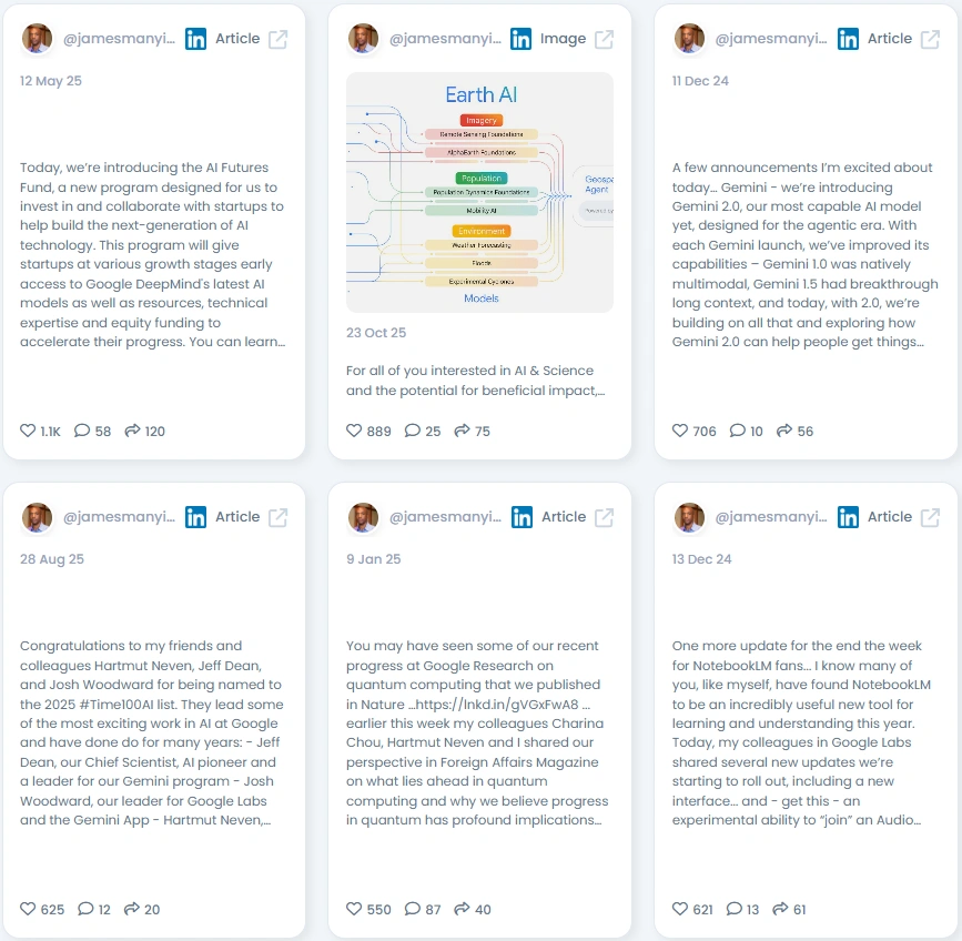 With a perfect Favikon Authenticity Score of 100/100, James’s credibility speaks for itself. Every post reflects his direct involvement in Google’s research, from AI model launches to quantum computing breakthroughs. His content never feels templated, but instead informed, purposeful, and rooted in real experience. Comments on his posts come from experts engaging on equal footing, proving that authenticity at this level of influence is not about being casual but about being genuine.