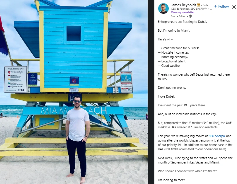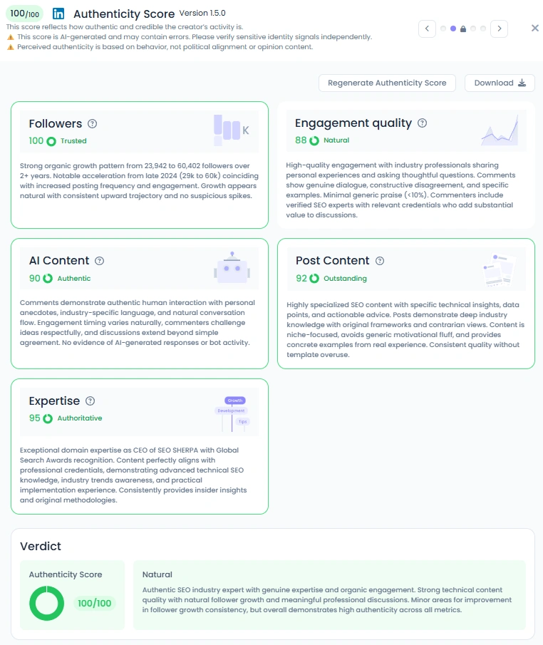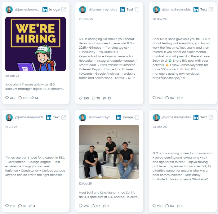 James holds a perfect 100/100 Authenticity Score, and it shows. He shares personal experiences, lessons learned, and even photos from travels or team wins. His comments are natural and conversational, often responding with detailed insights instead of quick replies. His content avoids templates and never feels manufactured. Instead, he gives real stories from SEO Sherpa and his own journey, keeping his presence relatable and human.