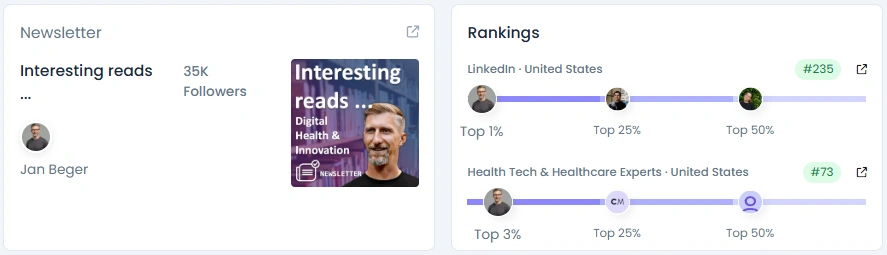 Jan’s following has grown steadily from 59K to 84K with no irregular spikes, reflecting a natural and loyal professional community. His Influence Score sits at 7,933 points, placing him in the Top 1% of LinkedIn creators in the U.S. and the Top 3% in Health Tech & Healthcare Experts. His posts regularly exceed 1,000 interactions, showing consistent engagement from an audience that values depth and expertise. His newsletter Interesting Reads reaches over 35,000 subscribers, a testament to the impact of his thought leadership.