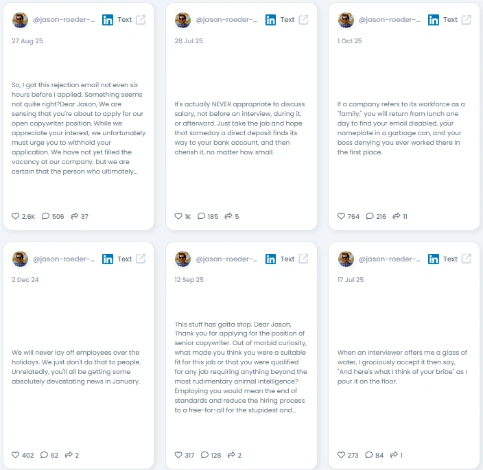 Jason Roeder has become LinkedIn’s sharpest comedic voice. He takes workplace nonsense, corporate clichés, and hiring absurdities and turns them into perfectly crafted satire.