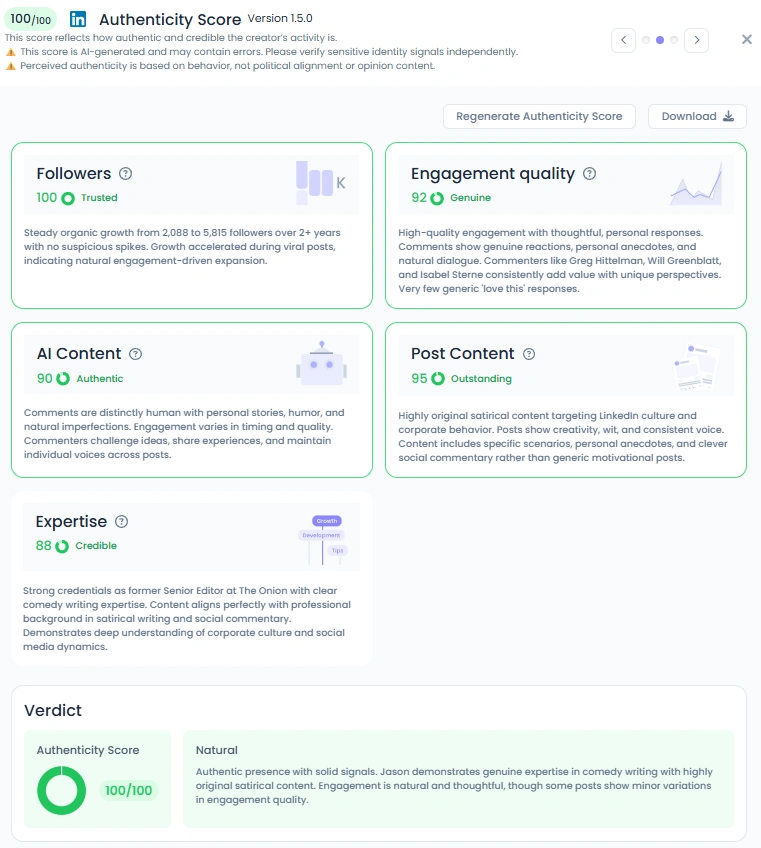 Jason holds a rare 100/100 Authenticity Score, and the reasons show up all over his feed. Comments show real human reactions with personal stories, arguments, and improvised humor. He shares original satirical content, specific scenarios, and personal anecdotes that feel lived rather than manufactured. His tone is consistent and unmistakable. Nothing about his presence feels templated. It feels like a writer at the top of his craft having fun with his audience.
