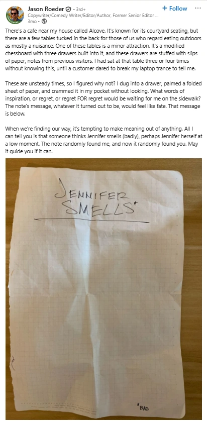 People listen because Jason writes with precision and personality. His posts blend dry humor with painfully accurate reflections on workplace culture. Every punchline feels earned and every scenario feels real. He uses the rhythm of short storytelling to keep readers hooked and delivers jokes that make people pause and reflect. The mix of comedy and truth gives his writing staying power.