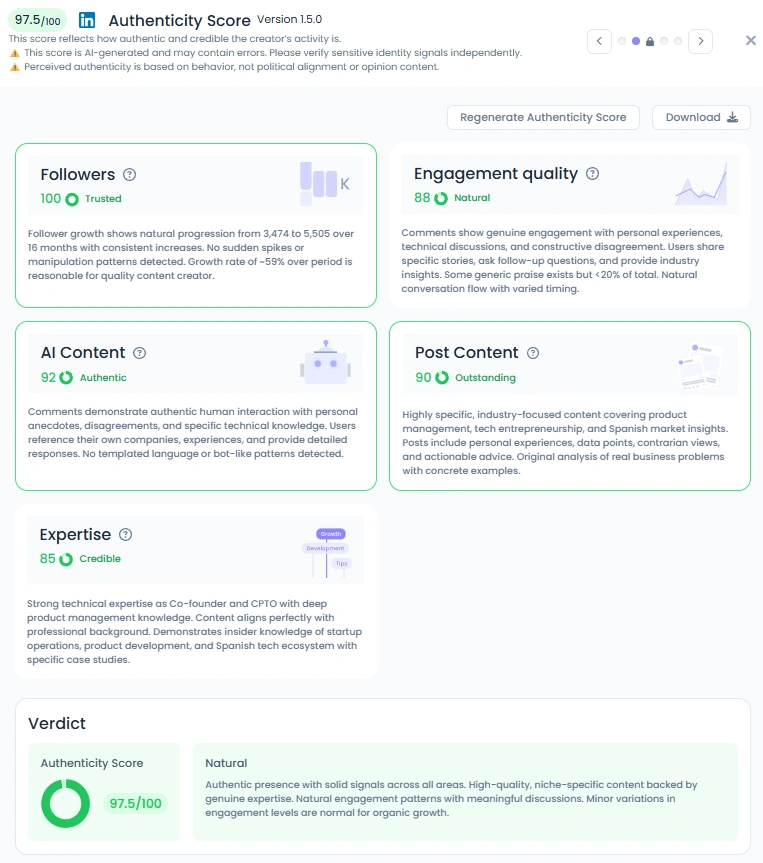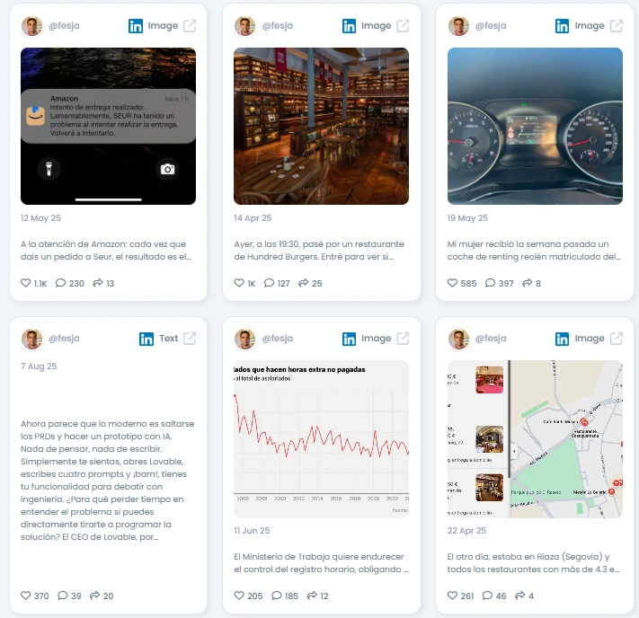 With a Favikon Authenticity Score of 97.5, Javier shows up in a way that feels real. He shares stories from restaurants, personal frustrations with logistics, or product examples from daily life. He posts charts, reflections, and moments from his work without over-polishing anything. The mix of professional analysis and everyday experiences makes his profile human and trustworthy. It is expertise without the ego.