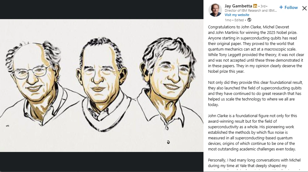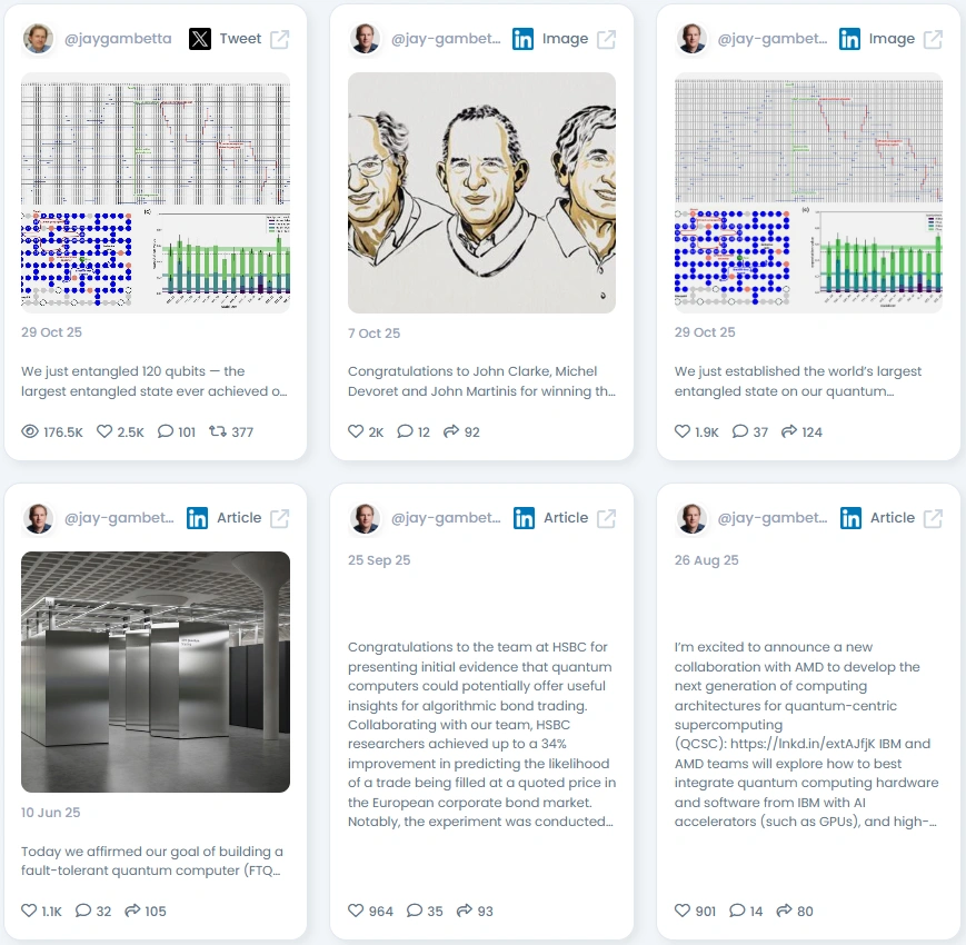Jay Gambetta isn’t just riding the quantum wave, he’s building the surfboard. As VP at IBM Quantum, Jay blends cutting-edge research with accessible insights, making even the most complex physics breakthroughs feel just a little more human. Whether it’s through milestone announcements or celebrating scientific peers, his posts are proof that credibility and curiosity can absolutely coexist.