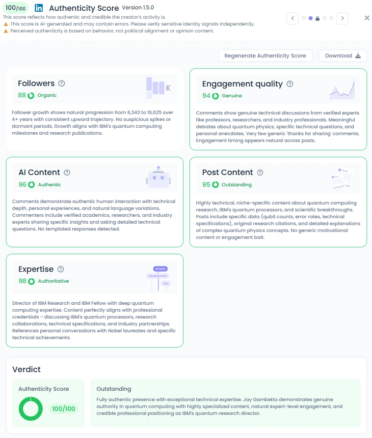 Jay scores a perfect 100 on Favikon’s Authenticity Score. Why? Because his content is deeply personal to his mission. From celebrating scientific awards to posting the largest entangled qubit state in history, it’s clear these aren’t just achievements for clout. They’re progress markers in a field he’s devoted to. His comment section is filled with physicists, researchers, and tech leaders engaging in real, nuanced conversation. No fluff. No filler. Just authentic, high-signal posts that elevate the conversation.