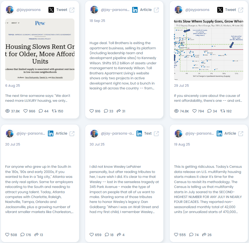 Jay Parsons is the rare creator who can brief a mayor, guide an investor, and still explain it so your neighbor gets it. He pairs rigor with accessibility, which is why his audience keeps growing and his posts keep circulating in board decks. If you need clear answers on rental markets and affordability, this is a voice worth amplifying. Practical, transparent, and relentlessly useful.