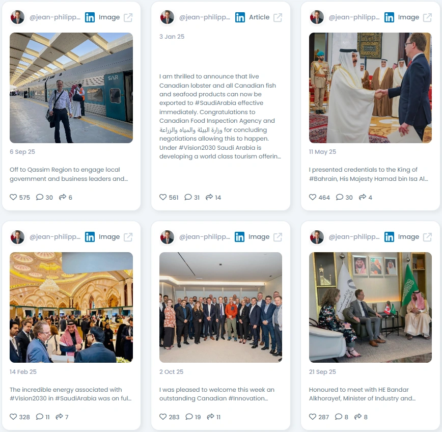 With a 100/100 Authenticity Score, Jean-Philippe stands out for his natural, trustworthy presence. His bilingual posts share genuine experiences from diplomatic life, cultural events, and international negotiations. Each update reflects his hands-on approach and Canadian values of openness and partnership. His tone is consistent and credible, showing diplomacy as both human and forward-thinking.