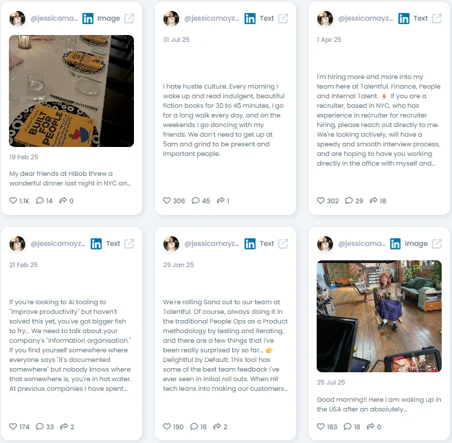 Jessica supports Radical Recruit and champions fair access to meaningful work. Her posts highlight humane hiring, anti-hustle culture, and the right to build a career without burning out. She models boundaries, slow mornings, and deep reading as productive habits. She uses her platform to normalize sustainable work rhythms and inclusive recruiting.