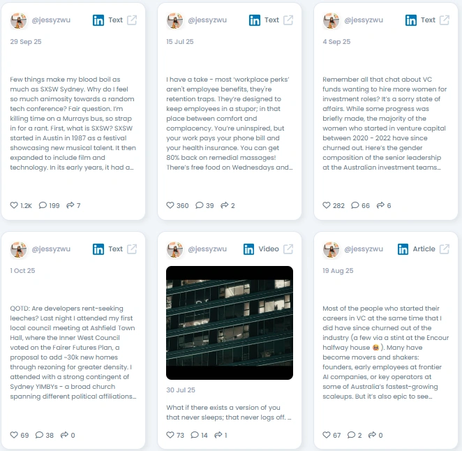 Jessy Wu brings heat and nuance to Australia’s tech conversation. She writes like an operator who reads the footnotes and shows her work. One day it is a thread on gender churn in VC. The next it is a housing policy debrief from a council meeting. People follow because she says the quiet part with receipts.