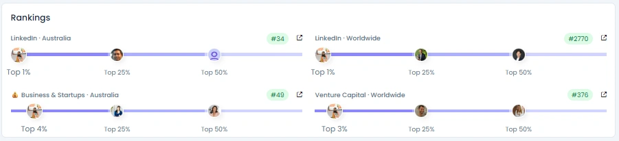 Jessy’s community grew from 15,230 to 22,510 followers over 4+ years with steady, organic curves. Engagement quality sits at 88 and Post Content scores 90 for depth and originality. Her Influence Score is 6,436 pts. She ranks Top 1% on LinkedIn in Australia (#34) and Top 3% in Venture Capital worldwide (#376).