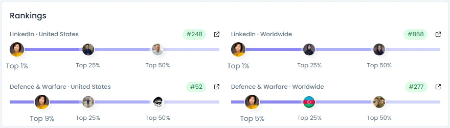 JoAnne’s LinkedIn community has grown from ~48K to 61K in two years with a natural, steady curve. Engagement quality is strong and consistent, driven by meaningful dialogue rather than generic praise. She posts often, averaging about 28 times per month, which keeps the conversation moving. Rankings place her in the top 1% on LinkedIn US and top 9% in Defence and Warfare in the US.