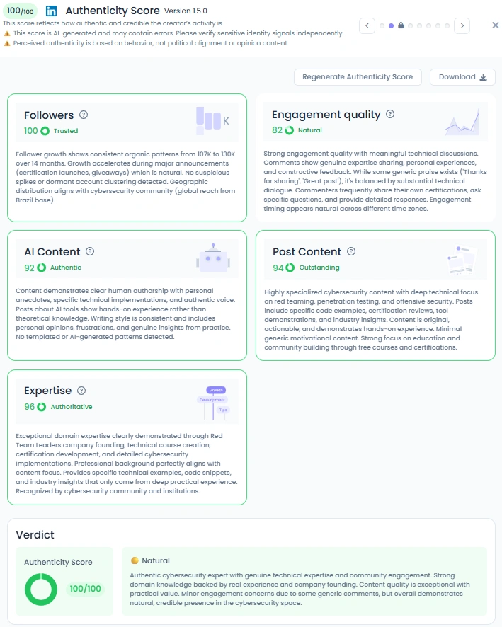 With a Favikon Authenticity Score of 100/100, Joas stands out for his transparency and genuine engagement. His posts reflect lived experience, not theory. He shares code examples, frustrations, and wins from his daily work, creating space for meaningful dialogue. His comments sections are filled with technical debates, certification discussions, and knowledge sharing. This blend of credibility and accessibility makes his voice one of the most trusted in the cybersecurity community.
