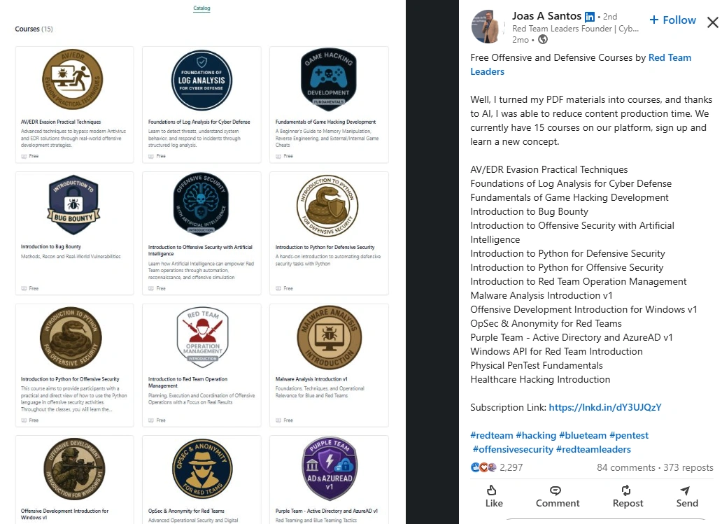 Joas collaborates with industry-leading initiatives and institutions that promote open cybersecurity education. His partnerships include Red Team Leaders, where he provides free training for offensive and defensive professionals, and collaborations with n8n, Mind The Sec, and other security-focused platforms. Through these partnerships, he’s helping shape the future of cybersecurity education with hands-on, accessible content for all skill levels.