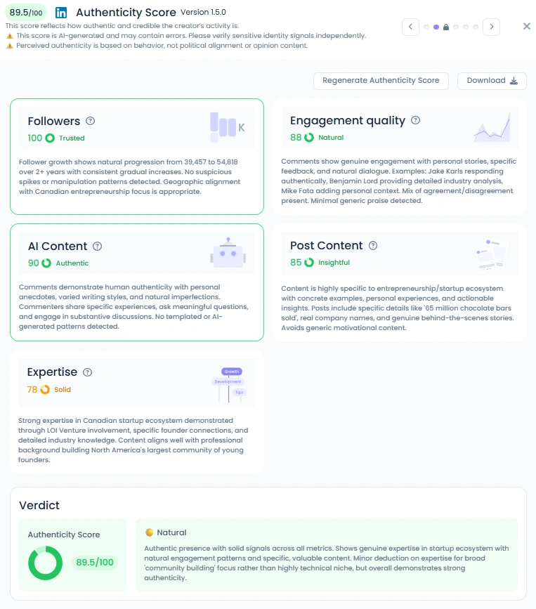 Follower growth is steady and natural, rising from about 39.5K to 54.8K in a little over two years. Influence Score sits at 7,131 pts. Engagement quality is rated 88 Natural with thoughtful threads and real founder names. Content scores land at 90 Authentic for AI Content, 85 Insightful for Post Content, and 78 Solid for Expertise. He also publishes the “Behind the Founder” newsletter with 25.4K followers.