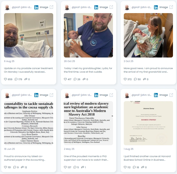 John Dumay brings a refreshing mix of academic rigor and genuine humanity to his online presence. His voice is warm, honest, and grounded in real moments from both research and life. He posts about his work with pride and about his family with joy, creating a rare balance that people instantly connect with. He is the kind of academic who makes complex ideas feel relatable and meaningful.