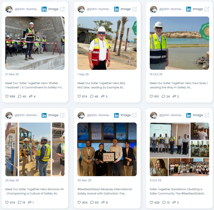 John is Group Head of Health and Safety at Red Sea Global and a respected leader in construction safety. He brings deep operational experience from large development projects and a track record of measurable safety improvements. His content highlights project-level achievements like LTI-free hours, award wins, and grassroots safety programs. He speaks from the field with certifications and practical frameworks that teams can apply immediately. He positions himself as a practitioner first and a strategist second which is why peers and frontline workers follow him.