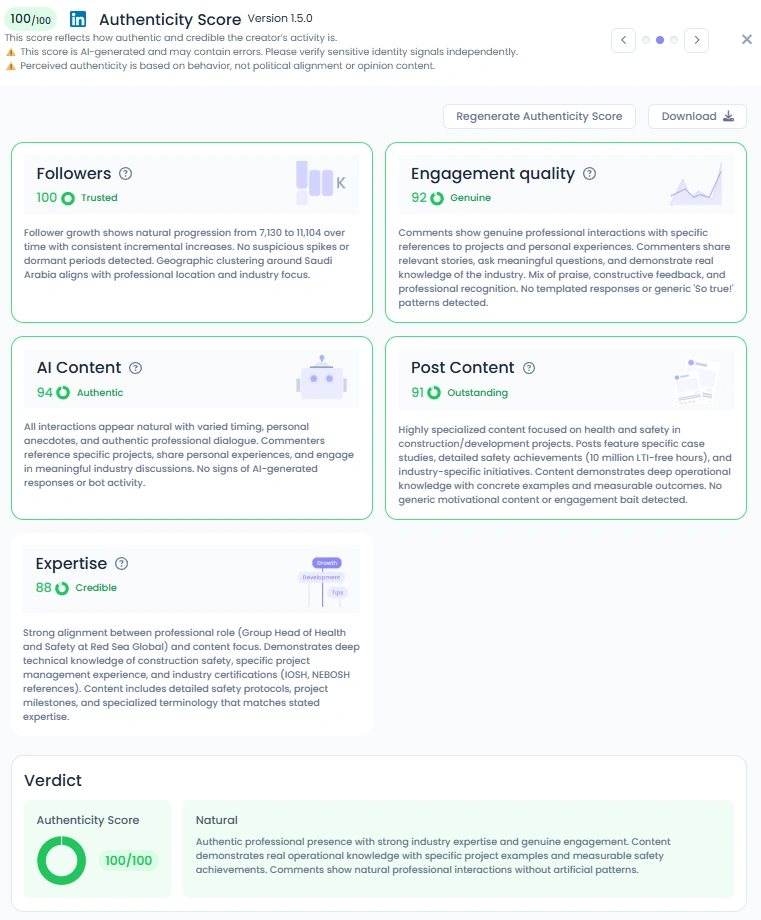 John scores 100/100 for Authenticity which matches what his feed shows. His posts include candid field photos, recognition for frontline workers, and humble reflections on safety challenges. There are no templated motivational posts. Instead you get project updates, award announcements, and practical how-tos which feel completely genuine.