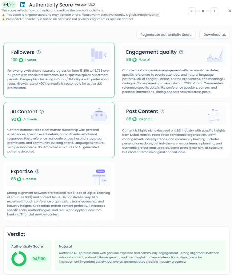 With an Favikon Authenticity Score of 94 out of 100, John strikes a solid balance between professional insight and genuine human connection. His content covers everything from promotion news and team shoutouts to thoughts on tech trends in learning. The language stays personal and natural, never overly templated. That’s probably why his audience shows up consistently in the comments with real feedback and support.