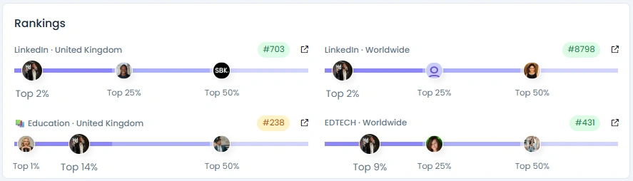 John has grown his audience from 13,888 to 16,769 over two years. His Influence Score sits at 5,893 points, supported by a strong engagement quality of 88 and highly trusted follower growth. His posts average strong reactions and comments, especially on milestones and event-related content. He also ranks in the top 2 percent on LinkedIn in the UK and worldwide in the EdTech category.