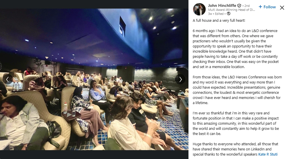 John Hinchliffe is one of those voices in EdTech that you instantly trust. His content is honest, grounded, and full of useful insights for anyone working in learning and development. Whether he's talking about digital learning trends or organizing community events in Dubai, his posts reflect someone deeply involved in his space. And people notice.