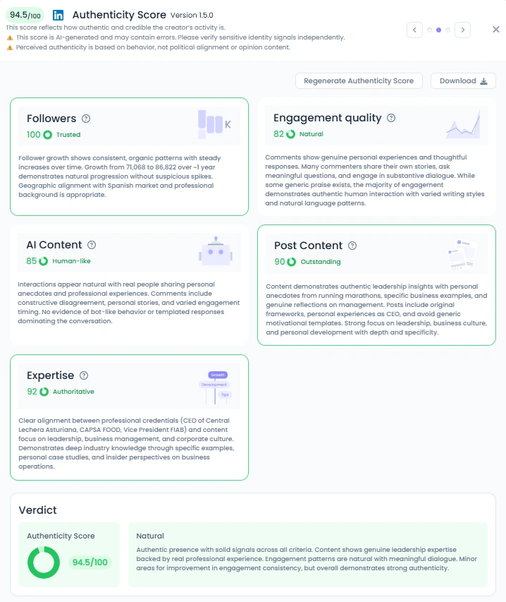 With a Favikon Authenticity Score of 94.5 / 100, José stands out as a genuinely human leader in the digital space. His posts feature real anecdotes from leadership, parenting, and running marathons all tied back to values like perseverance and empathy. Engagement is organic, with professionals adding thoughtful reflections rather than surface-level praise. His presence feels like a conversation, not a campaign.