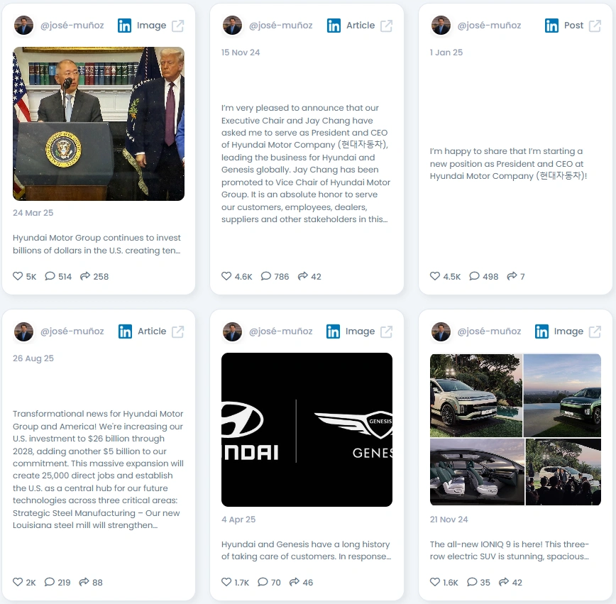 José boasts an Influence Score of 7,392 points, placing him in the Top 1% of LinkedIn creators in Spain and the Top 1% in the global Car Industry category. He ranks #11 in Spain and #45 worldwide in his sector, confirming his global influence. His posts regularly reach thousands of reactions and comments, especially on major announcements about Hyundai’s growth in the U.S. and its electric vehicle roadmap. His steady activity and balanced tone have made him one of the most respected executives on LinkedIn.