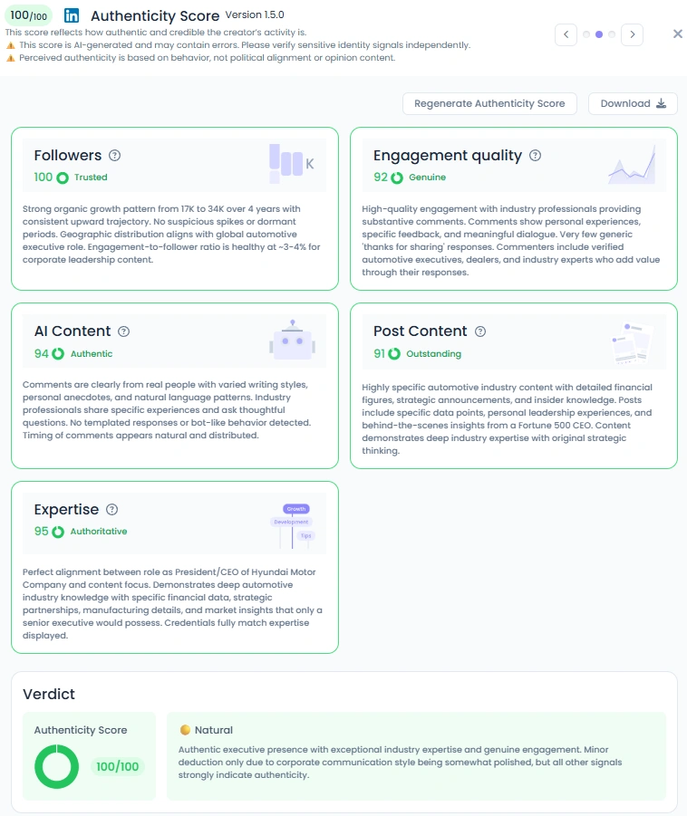 José Muñoz holds a Favikon Authenticity Score of 100/100, a rare mark of credibility among global executives. His followers have grown organically from 17K to 34K over four years, showing consistent engagement and trust. With an Engagement Quality of 92 and AI Content rating of 94, José’s posts demonstrate meaningful dialogue with real industry professionals. His communication is transparent and insightful, showing that even corporate leadership can feel personal and authentic.