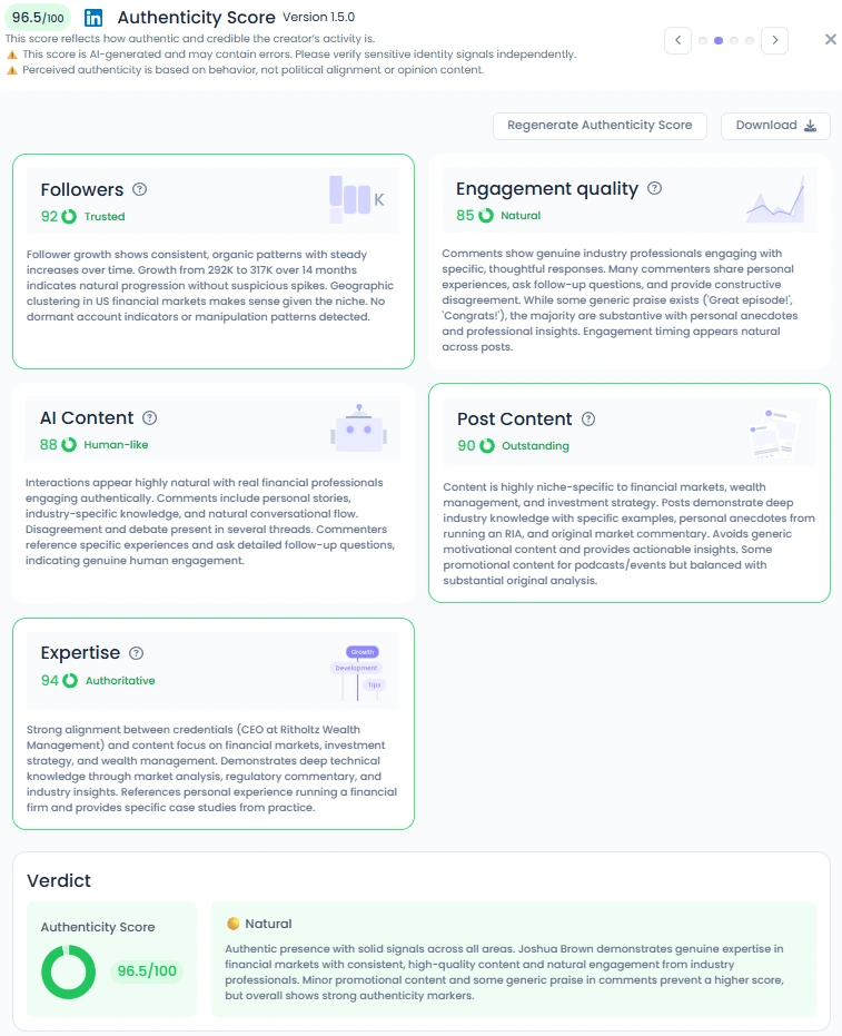 With an Favikon Authenticity Score of 96.5/100, Joshua’s presence feels natural and trustworthy. His posts aren’t corporate press releases. They are human, sometimes humorous, and always clear. He shares photos from events, personal reflections, and offbeat observations that make him relatable. Even when discussing technical market analysis, he stays conversational and avoids the clichés of financial thought leadership.
