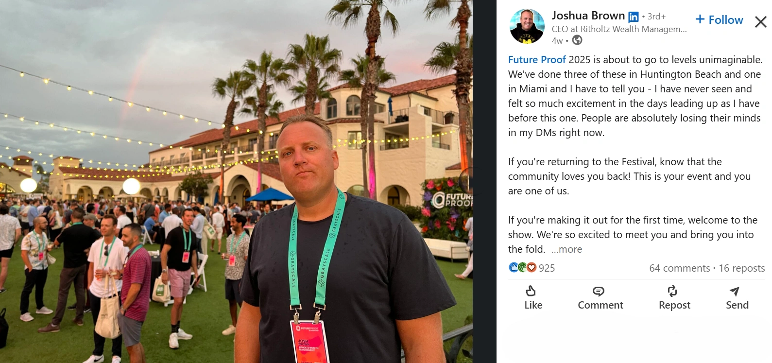 Joshua Brown is the CEO of Ritholtz Wealth Management, an investor, author, and well-known media figure in finance. Over the years, he has built a reputation as “The Reformed Broker,” combining sharp financial insights with storytelling that resonates with both professionals and everyday investors. His career milestones include co-founding one of the most influential RIAs in the U.S., becoming a regular on CNBC’s Halftime Report, and publishing bestselling books on investing. Today, he balances running a firm with engaging a global audience across LinkedIn, Twitter, and other platforms where his financial commentary thrives.