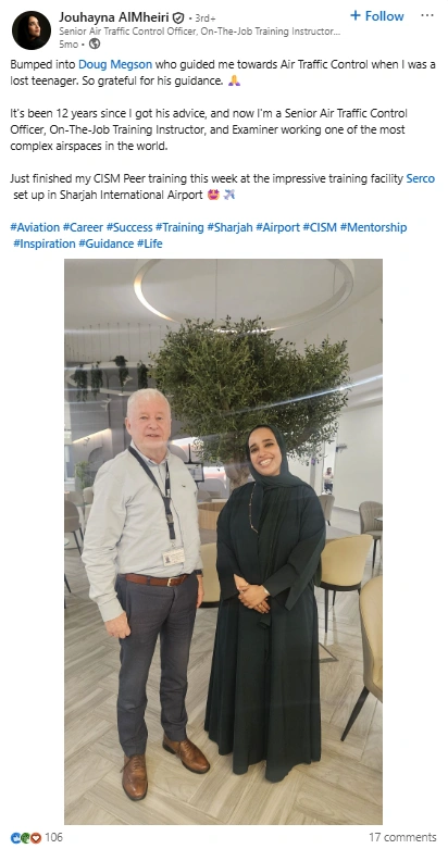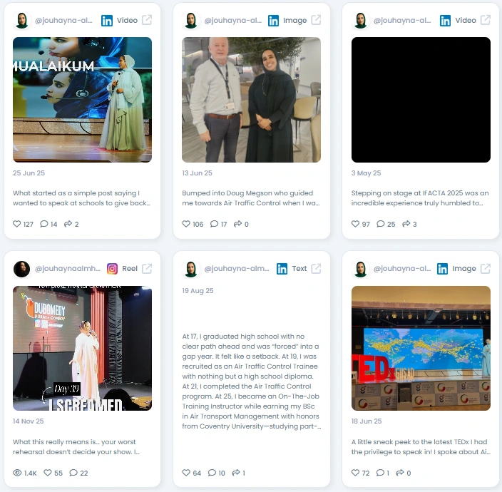 Jouhayna moves confidently within a network that spans global aviation, government institutions, and major training organizations. She appears alongside industry leaders, senior instructors, aviation authorities, and international training bodies. Her presence at TEDx events, IFATCA engagements, and aviation programs reflects strong credibility and recognition. Brands like Serco and the UAE General Civil Aviation Authority sit in her orbit, reinforcing her position in the professional aviation ecosystem.